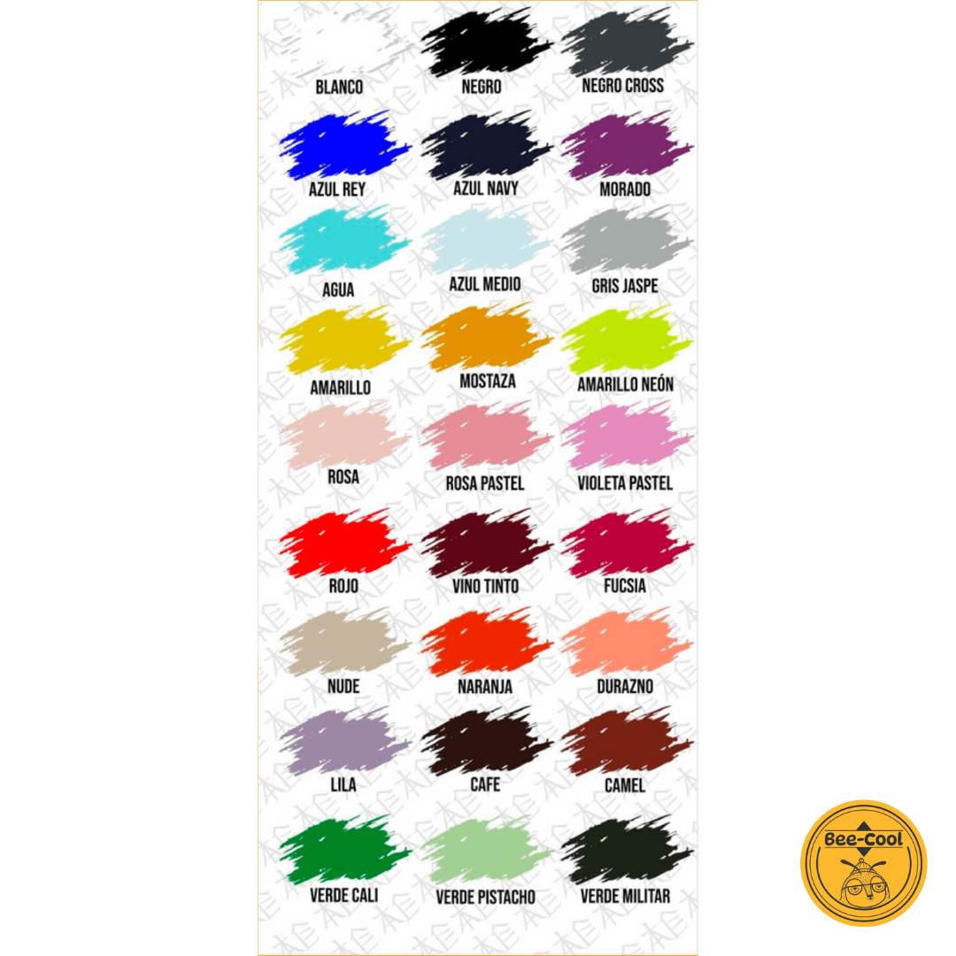 blanco, negro, negro cross, azul rey, azul navy, morado, agua, azul medio, gris jaspe, amarillo, mostaza, amarillo neón, rosa, rosa pastel, violeta pastel, rojo, vino tinto, fucsia, nude, naranja, durazno, lila, café, camel, verde cali, verde pistacho, verde militar